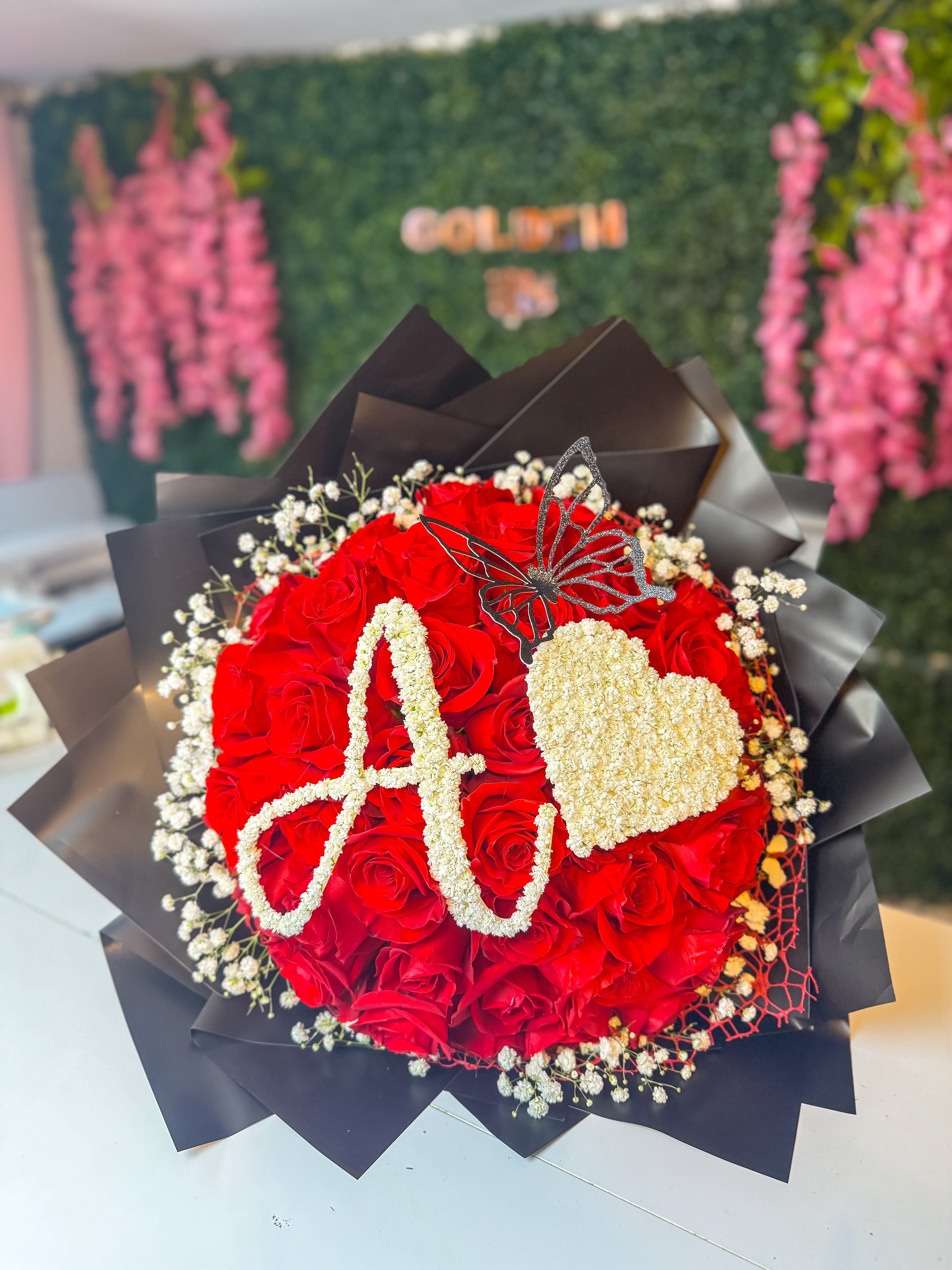 Luxury Roses arrangement ,50 premium red roses, an a custom baby breath initial.