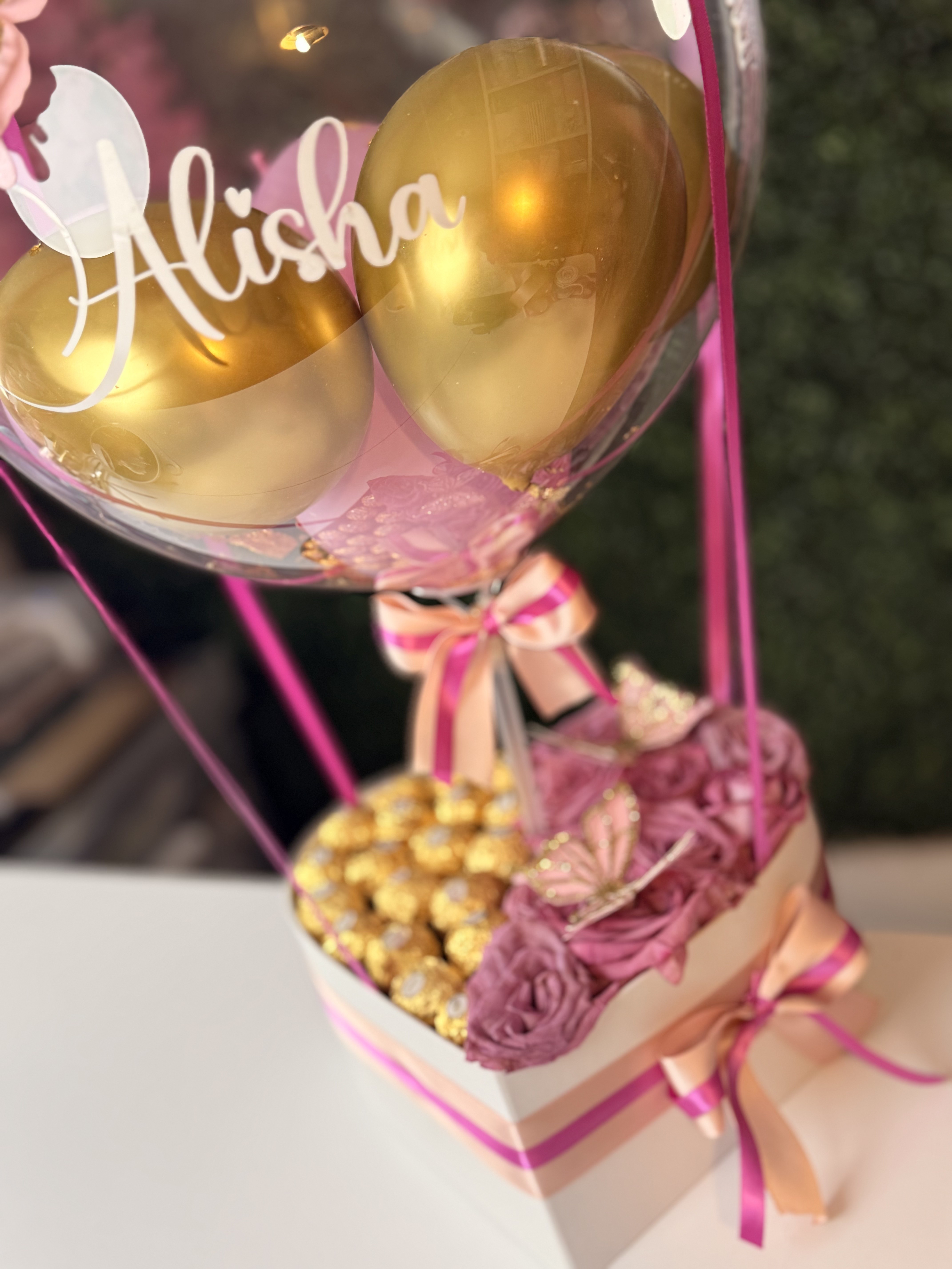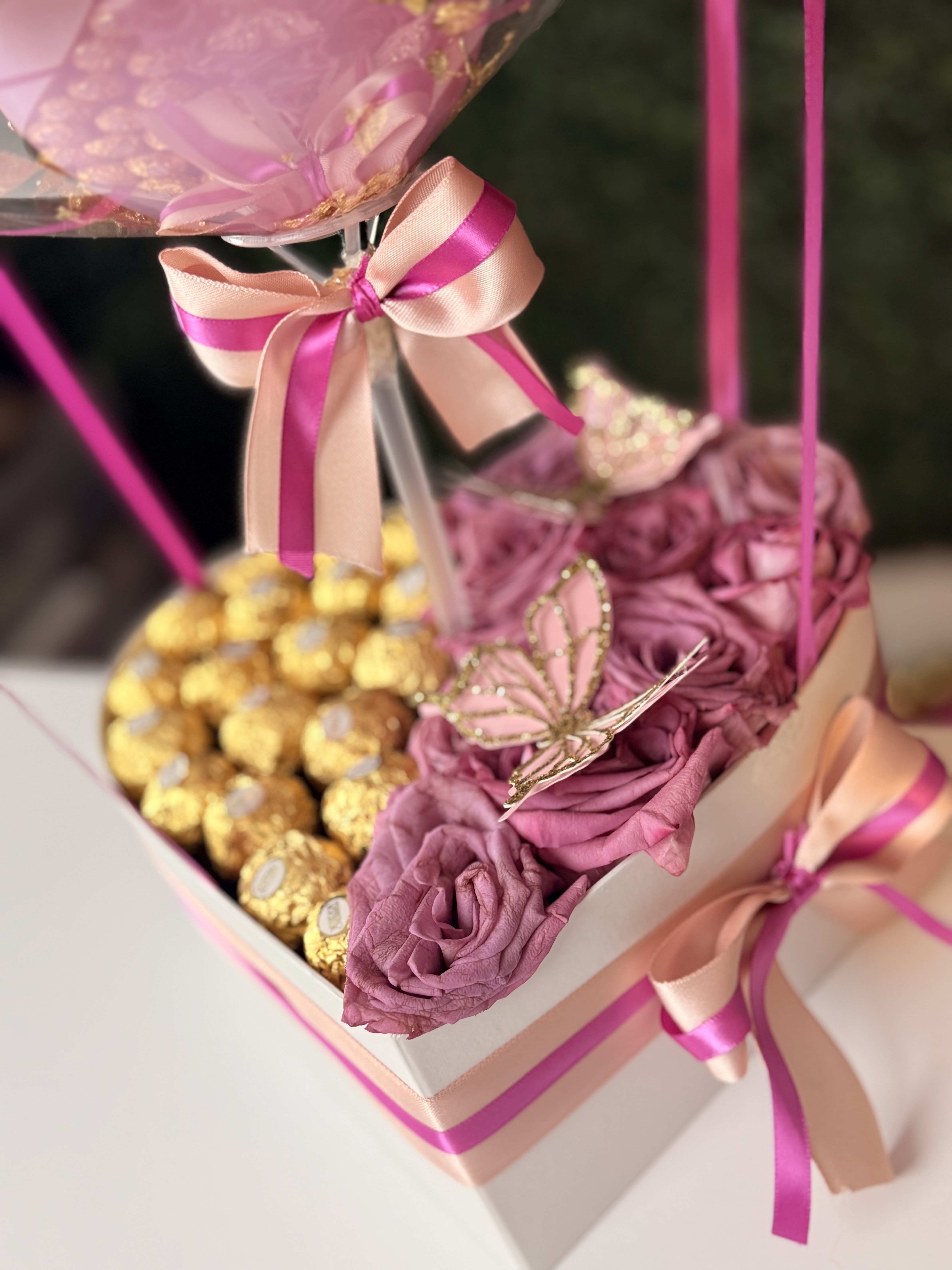 A heart-shaped gift box filled with roses, Ferrero chocolates, and topped with a personalized balloon adorned with butterflies and golden accents. Elegant, romantic, and perfect for any special celebration. 💕✨ Substitution Disclaimer: Photos represent the overall design and style of the arrangement. In case of unavailability, we may substitute flowers, containers, or colors with items of equal or greater value that preserve the essence, look, and feel of the original design. The final product will maintain the same quality and aesthetic vision, even if specific elements differ slightly.